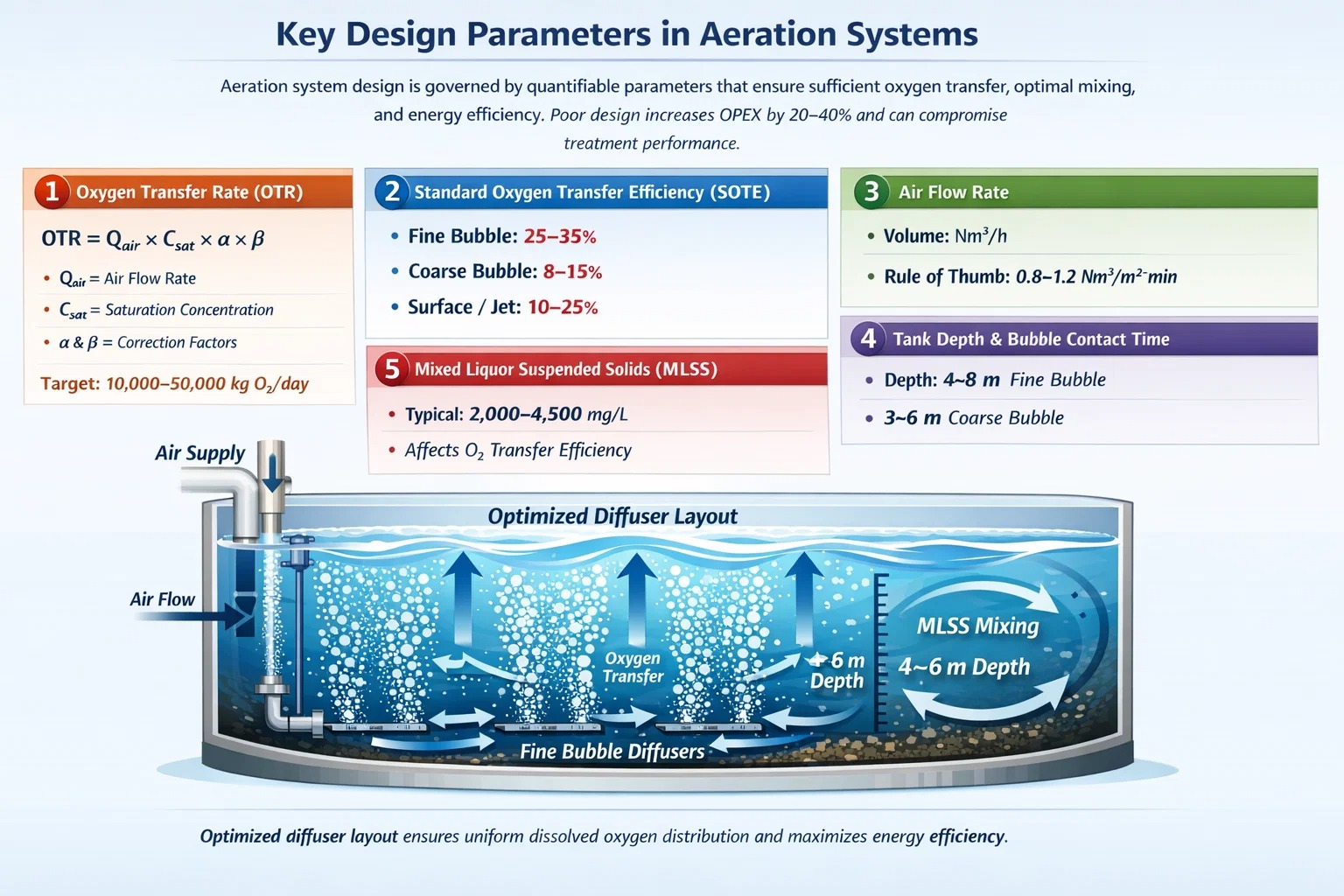 Hapen siirto: Hienot kuplahajottimet achieve 25–35% SOTE; oxygen demand must match biological load.