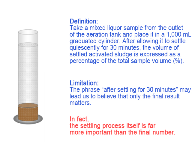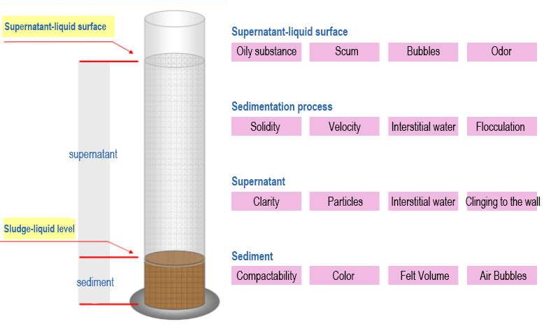 | Laskeutumisnopeus | Ensimmäinen flokkulaationopeus ja vapaan ja flokkuloivan laskeutumisen nopeus; nopeus, jolla liete-vesi-rajapinta muodostuu. | 1. Aktiivilietteen aktiivisuus (suurempi = nopeampi); 2. Lietteen vanheneminen (vanhempi = hitaampi); 3. Lietteen myrkyllisyys (myrkyllinen = hitaampi); 4. Lietteen viskositeetti (suurempi = hitaampi); 5. Filamenttinen bulkointi (kokonaisuudessaan hitaampi); 6. Lietteen pitoisuus (varhainen flokkuloiva laskeutuminen); 7. Suspendoituneen kiintoaineen pitoisuus (suurempi = hitaampi); 8. Veden lämpötila ja viskositeetti. |