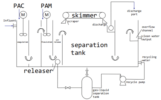 Jätevesi tai prosessivirta syötetään DAF-säiliöön.